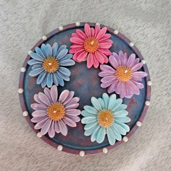 This vibrant handmade tray features a stunning arrangement of scented daisy candles in soft pastel shades. With a pearled edge and cosmic-inspired color base, it’s perfect as a cheerful décor item or a thoughtful gift. Each daisy candle is delicately crafted and scented with floral notes to brighten up any room.Key Features